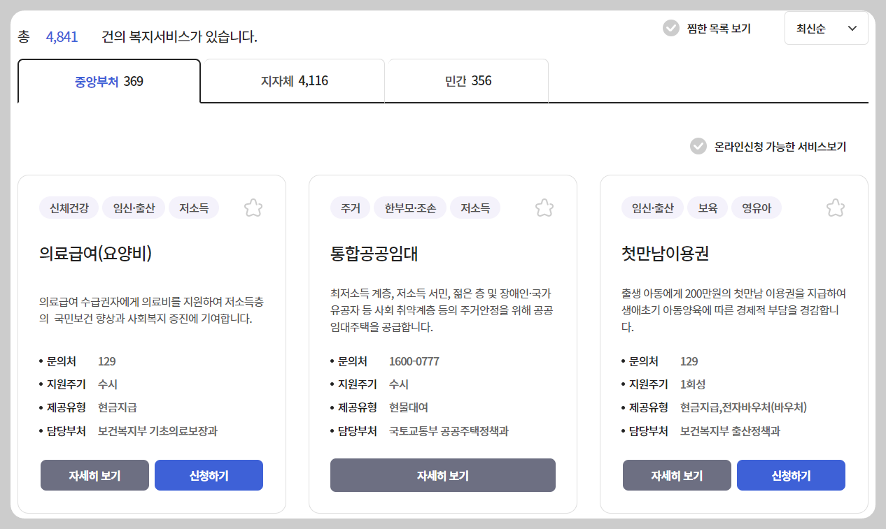 이 사이트를 통해 많은 복지서비스와 정부지원금에 대한 정보를 확인하고, 실제로 복지서비스를 직접 신청할 수 있습니다.