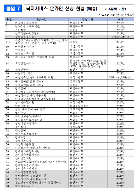 이로써, 복지로를 통해 온라인 신청이 가능한 사업은 45종에서 50종으로 확대되었습니다.